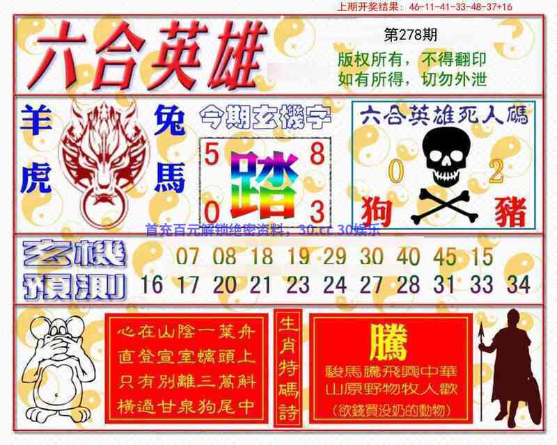 281期:必中天机/特七决/正版欲钱料/特码生肖诗/澳门天机诗